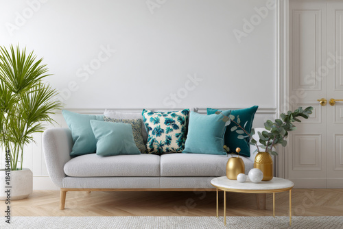 © wolfhound911, Naklejka premium 3D visualization of a modern living space with a sofa and stylish decor set against a white backdrop.