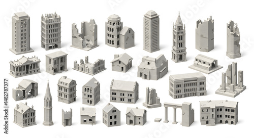 © 1St TH, Obraz premium 3D Voxel Art Collection of Buildings Various Architectural Styles and Damage Isolated White Background