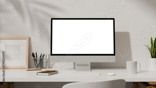 © Prathankarnpap, Naklejka premium 3D workspace with desktop computer, office supplies, houseplant and books at office