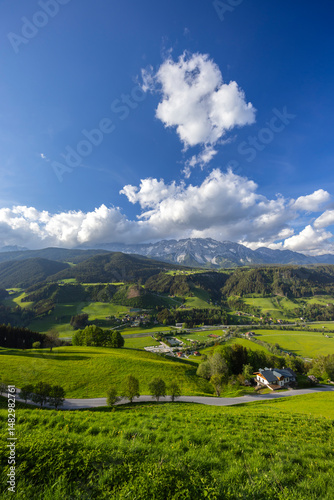 © Richard Semik, Obraz premium Dachstein Glacier towering over Schladming valley in Styria, Austria, during a sunny spring day