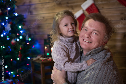 © Evgenia Tiplyashina, Obraz premium Dad and daughter at the Christmas tree