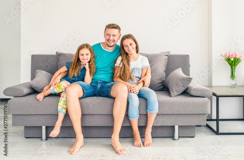 © tan4ikk, Obraz premium Dad and his two smiling daughters