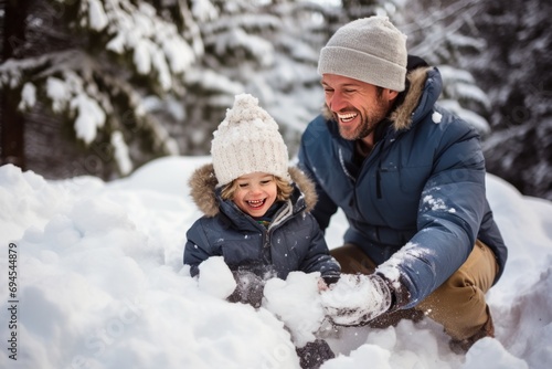 Obraz premium Dad and son enjoy a snowy day, playful snowball fights