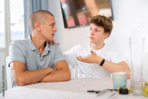 Fototapeta premium Dad and son sitting at the table together and having conversation