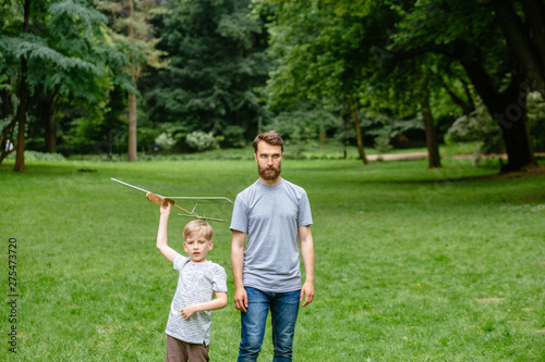 © Iryna, Obraz premium Dad and son together launch model airplane outdoors, both man and boy are looking cheerfully at plane. Father and son spending good time together, family relationships concept. Full leight