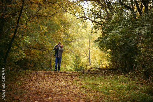 © April, Fototapeta premium Dad and son walking in leaves