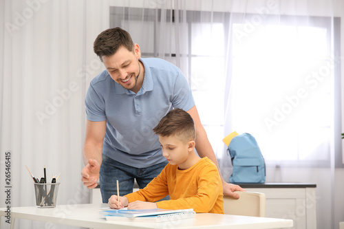 Fototapeta premium Dad helping his son with homework in room, space for text