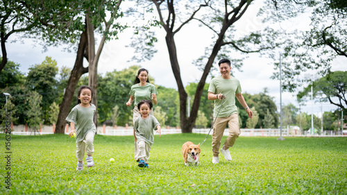 © bongkarn, Fototapeta premium Dad holding a leash on corgi puppy while walking or running with mom son daughter on grass in park.