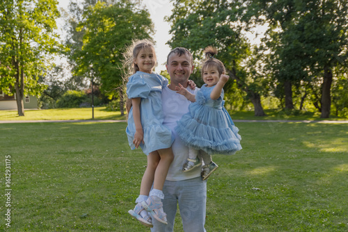 © Татьяна Зернова, Fototapeta premium Dad holds his two daughters in his arms, a walk in the city park, family leisure time