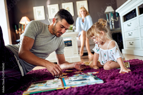 Fototapeta premium Dad with daughter playing with puzzles