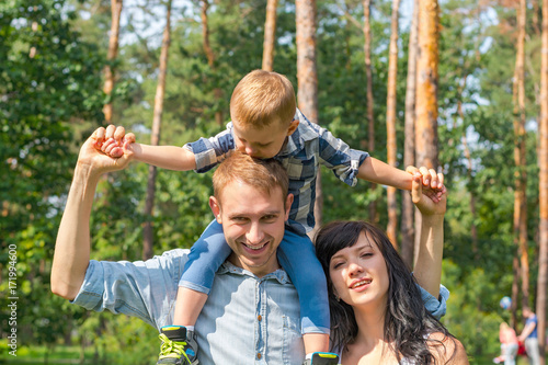 Fototapeta premium Daddy carries his son on his shoulders, mom laughs next to them.