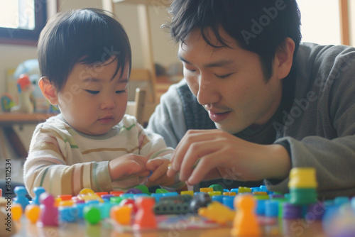 © Suriyo, Fototapeta premium Daddy helps his child learn to count and sort objects