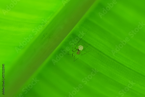 Fototapeta premium Daddy long legs spider with eggs up side down under banana green leaf. selective focus