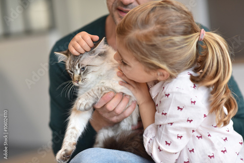 © goodluz, Fototapeta premium Daddy with little girl petting cat at home