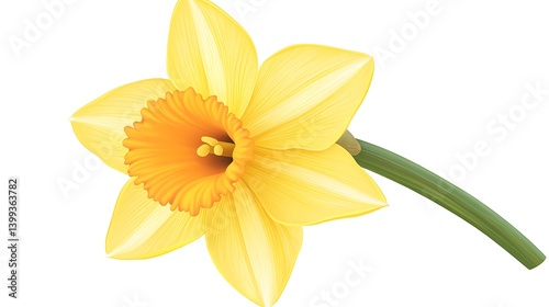 © Asrianto, Fototapeta premium Daffodil blooms, a single yellow flower on a green stem, against white background, suitable for spring decor