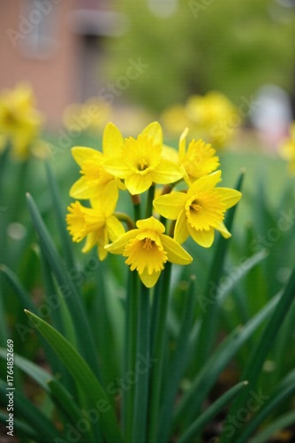 © Sanook, Fototapeta premium Daffodil Patch against a Blurred Green Background A visually appealing cluster of yellow daffodils in sharp focus, with the surrounding greenery and background rendered in a soft, artistic bokeh blur.