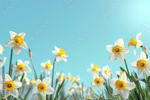 Fototapeta premium Daffodils blooming under a clear blue sky offer a perfect spring background for text adding
