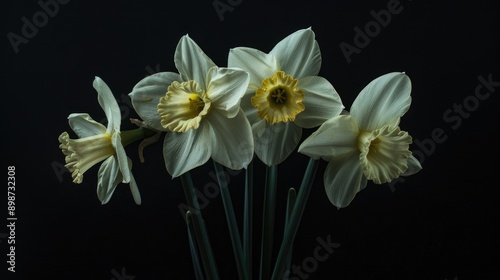 © Emin, Fototapeta premium Daffodils in white and yellow against a dark black backdrop