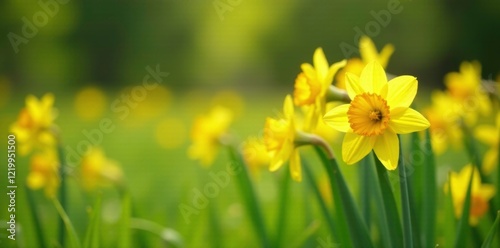 Fototapeta premium Daffodils swaying gently in a meadow of tall grass, , yellow