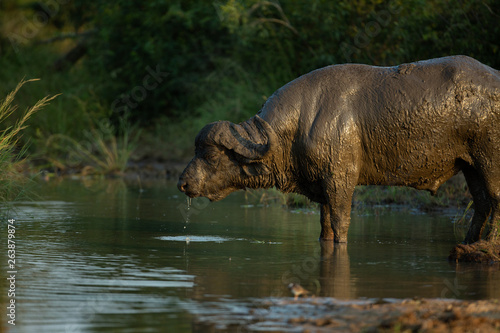 © Darrel, Fototapeta premium Dagga boy all covered in mud busy drinking water