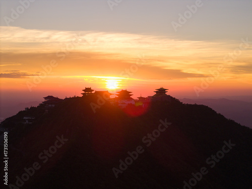 Obraz premium Dahong Mountain peaks, bathed in a colorful sunset, overlook the Suizhou...