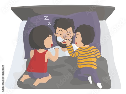 Obraz premium Daily routine with kids, two kids drawing on their father's face while he is in bed