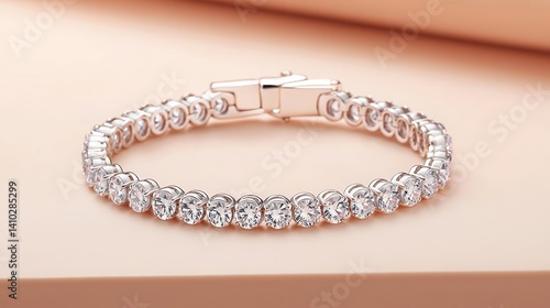 © Creator88, Fototapeta premium Dainty handcrafted tennis bracelet with round diamonds in a teardrop arrangement, isolated on a light peach surface