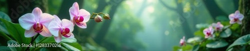 Fototapeta premium Dainty orchids and ferns gently swaying in a misty forest atmosphere,...