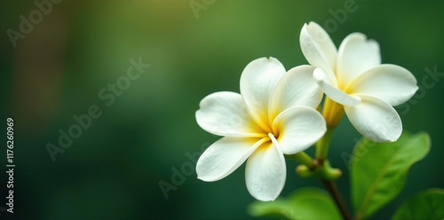 Fototapeta premium Dainty white petals with bright yellow centers and green stems, flowers, gardenia, delicate