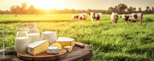 Fototapeta premium Dairy Delight: Farm Fresh Cheese and Milk at Sunset