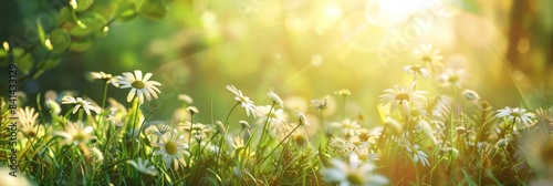 © Bundi, Obraz premium Daisies bloom in a yellow summer field in a banner panorama.