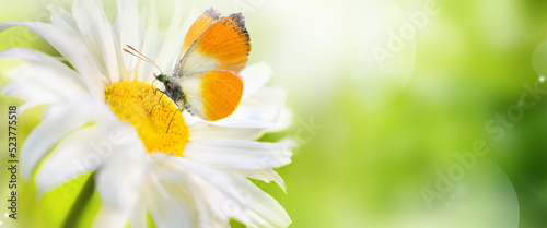 Obraz premium Daisy flower and butterfly on green spring background