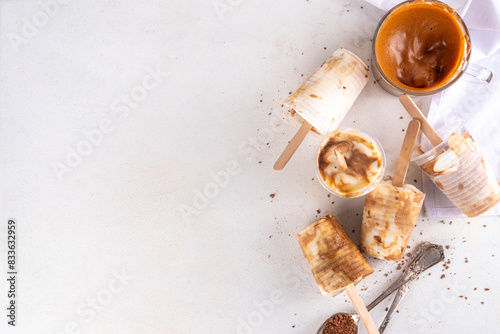 Fototapeta premium Dalgona coffee popsicle ice cream, Whipped instant coffee espresso gelato on...