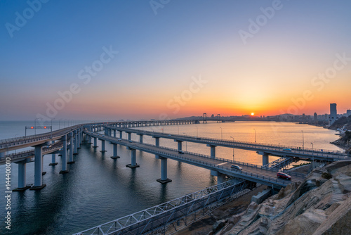 © fanjianhua, Obraz premium Dalian Cross-Sea Bridge at dusk.
