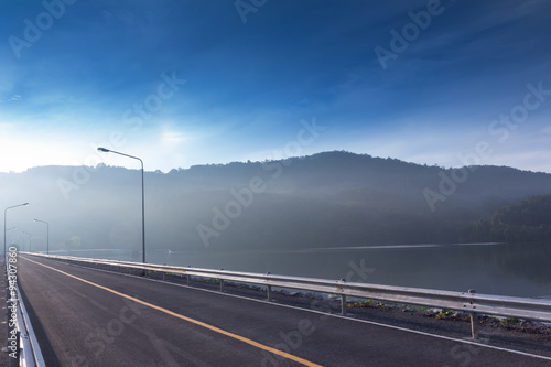 © wanchai, Fototapeta premium Dam and mountains under mist in the morning