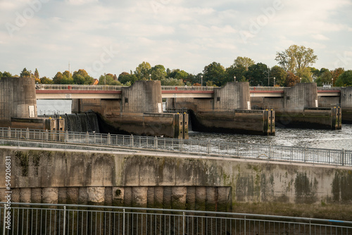 Fototapeta premium Dam (weir) of a hydro power plant along Weser river (Bremen). Water cascading...