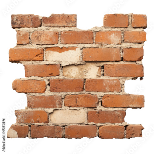 © Siriluck, Obraz premium Damaged brick wall with missing sections and rough texture, showcasing beauty of decay and age