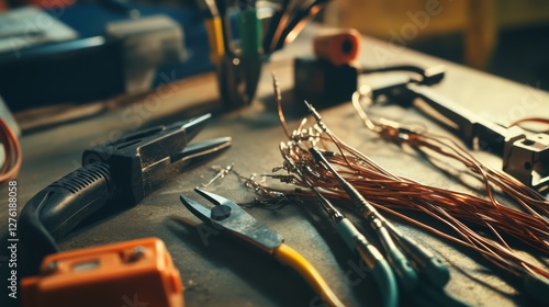 © Allie, Fototapeta premium Damaged cables on a desk with soldering tools. Featuring frayed edges and exposed copper