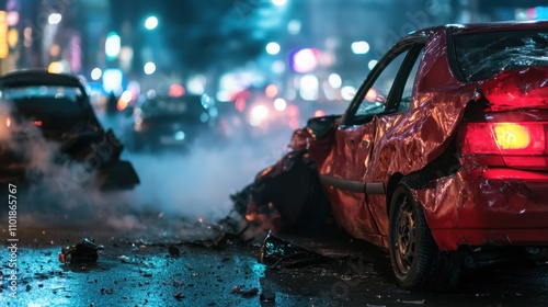 © 69, Fototapeta premium Damaged cars in a rear-end collision with smoke and blurred lights, capturing the tension of the crash aftermath