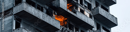 © Lila Patel, Fototapeta premium Damaged Concrete Building with Interior Illumination