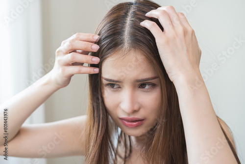 © KMPZZZ, Fototapeta premium Damaged hair symptom, problem hair fall asian young woman, girl worry about balding, looking at scalp in mirror, hand in break into front hair loss, thin problem. Health care treatment for beauty.