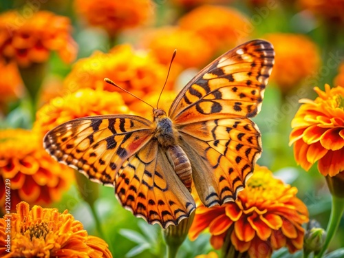 © Man888, Fototapeta premium Damaged Orange Butterfly on Marigold, Shanghai, China - Stock Photo