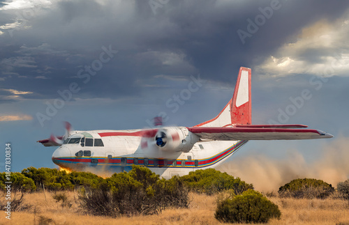 © milkovasa, Fototapeta premium Damaged propeller plane makes a hard landing on a plain