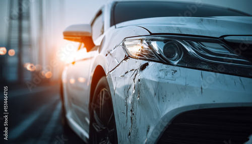 © Mr. Orsetto, Fototapeta premium Damaged white car with scratches and dents on the front side in an urban setting at sunset