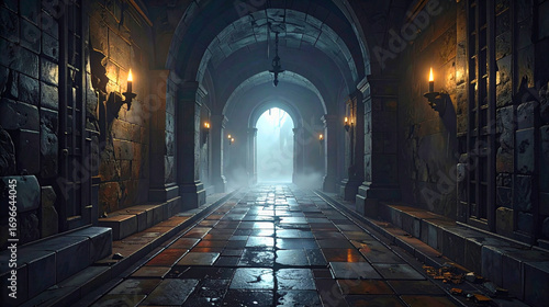 © Pankaj Kumar, Fototapeta premium Damp Stone Floor Detail With Misty Background And Light Rays