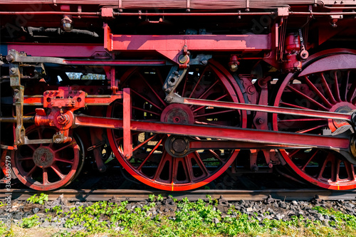 © ON-Photography, Naklejka premium Dampflok Eisenbahn Deutschland Gestänge Kolben Schnellzug Räder Einheitllok Baureihe 01 Treibräder Details Zylinder Gestänge Kuppelstange Metall rot Öl Technologie Nostalgie Stahl Mechanik Zug