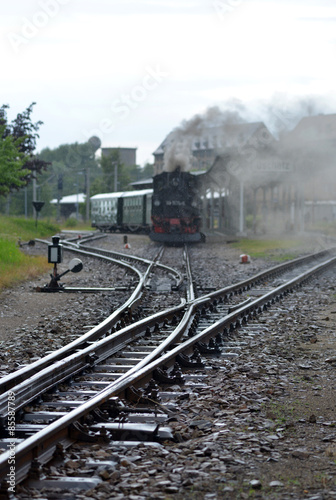 Obraz premium Dampflokomotive im Regen am Bahnhof