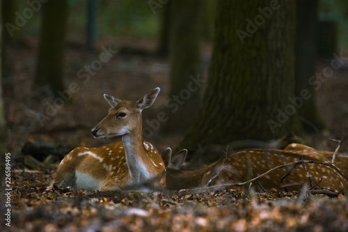 Fototapeta premium Damwild liegt ein einem Wald innerhalb eines Geheges
