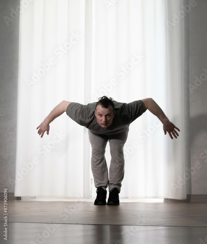 © Andrii, Fototapeta premium Dance in motion, pose of a man in hip-hop style clothes. Sports dancing guy in training poses. Dance training at home.