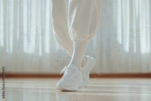 © Papukos, Fototapeta premium Dancer wearing white sneakers and sweatpants is practicing a new choreography